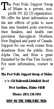 ![Text Box: The Post Polio Support Group of Maine is a private, non-profit 501 [c] (3) organization. We offer the latest information on the late effects of polio to more than nine hundred polio survivors, their families, and health care providers throughout Northern New England and parts of Canada. Support for our work comes from donations from the public, from Alpha One, and from a grant furnished by the Pine Tree Society. For more information, contact us at: